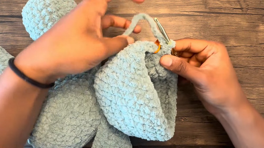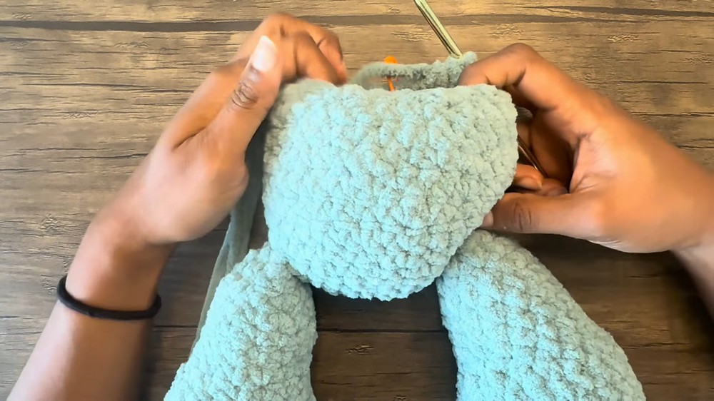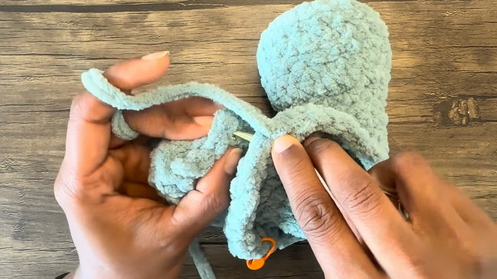 - Join first leg to next 4 sts: For each joined st, insert through both the body and the leg, work 1 sc.