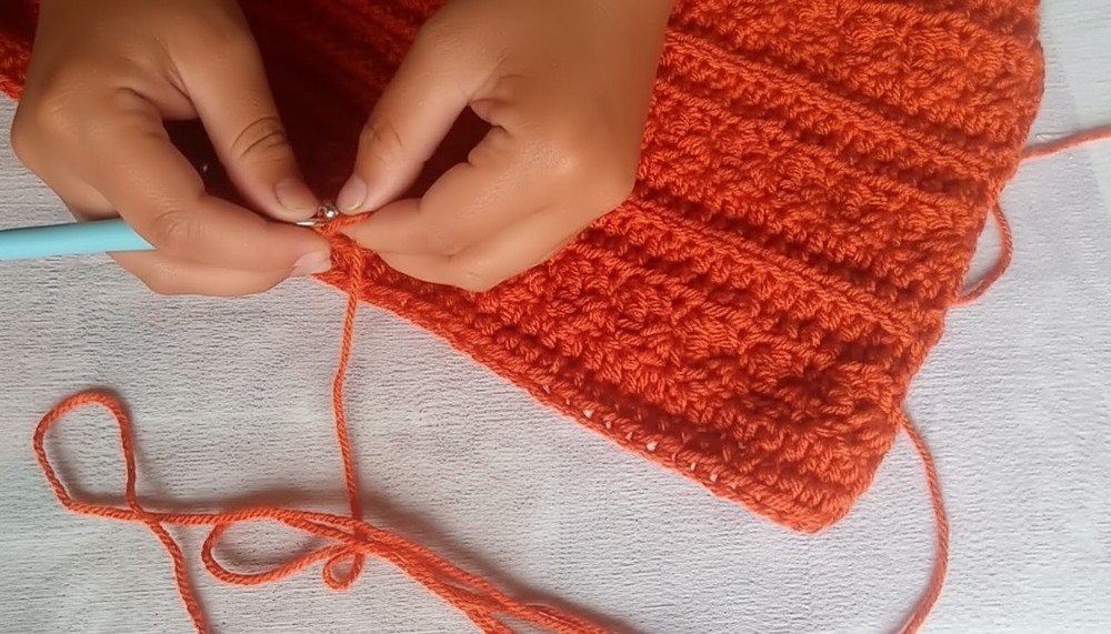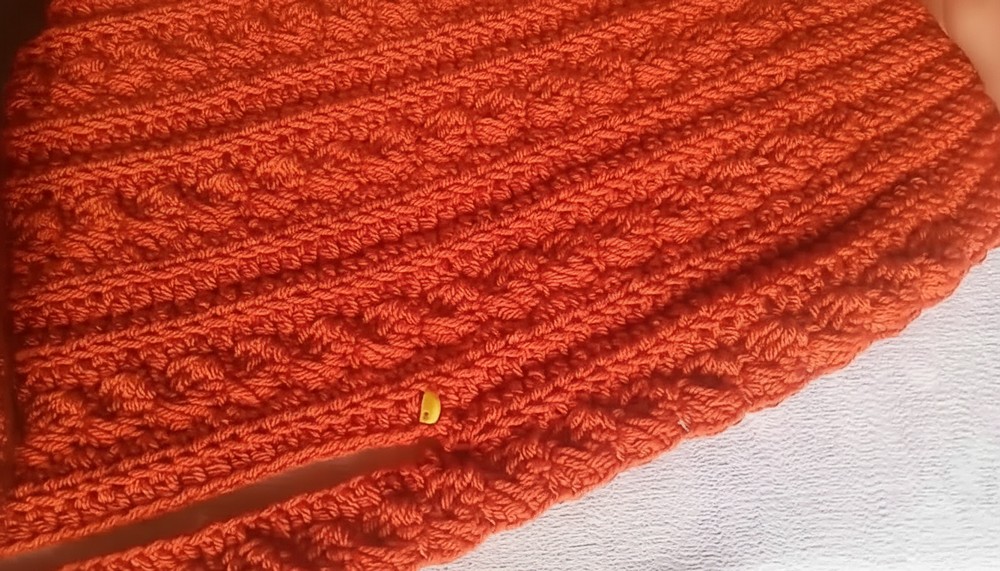 - At end of row, continue with hdc: After last sc, simply yarn over and hdc in next stitch, then continue making hdc to the desired length from the bottom edge to the shoulder (this will be the height of your cardigan: crop or long).