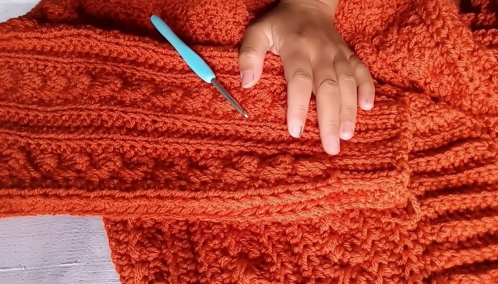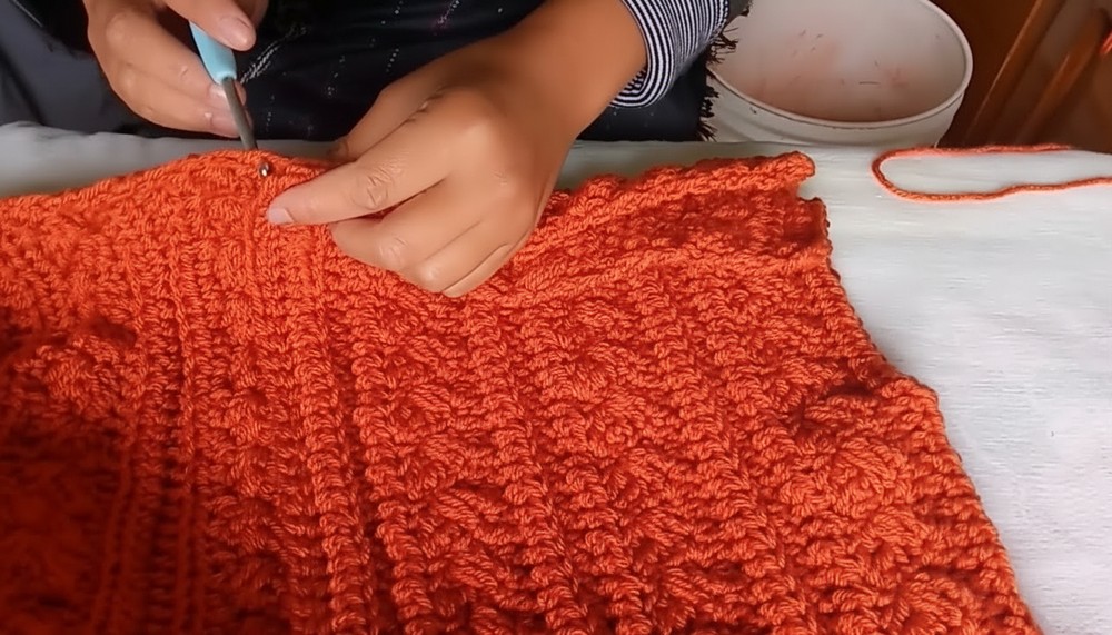 - Create the chain for the second underarm, skip needed number of stitches, then continue the rows for the other front.