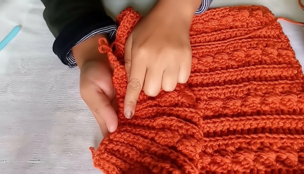- With yarn and hook, single crochet seam up the sides through both thicknesses for side seams (matching rows and shell patterns).