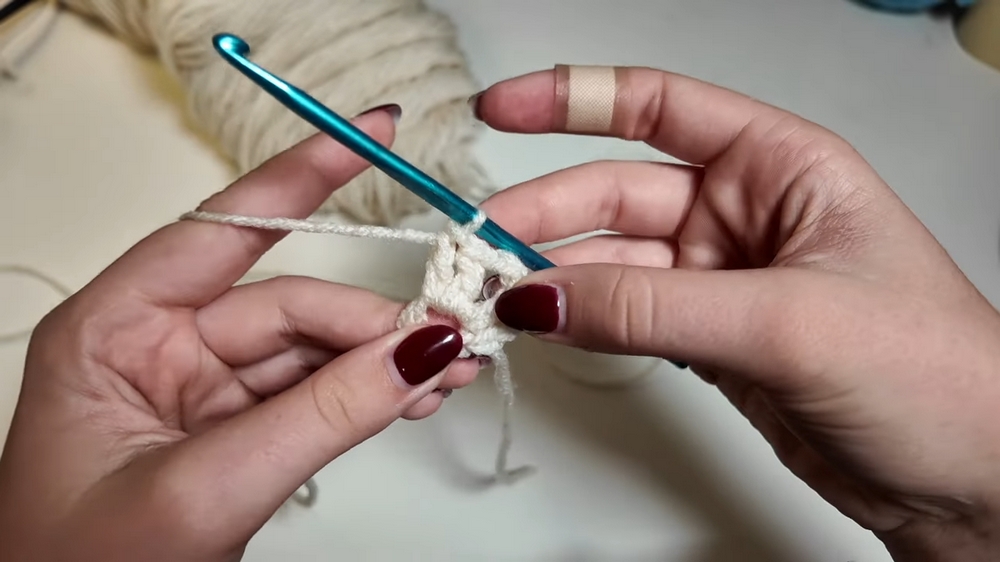 - Chain 2, then repeat steps to create alternating double crochets and chain-2 spaces. Keep repeating this process until you have 8 chain-2 spaces in total.