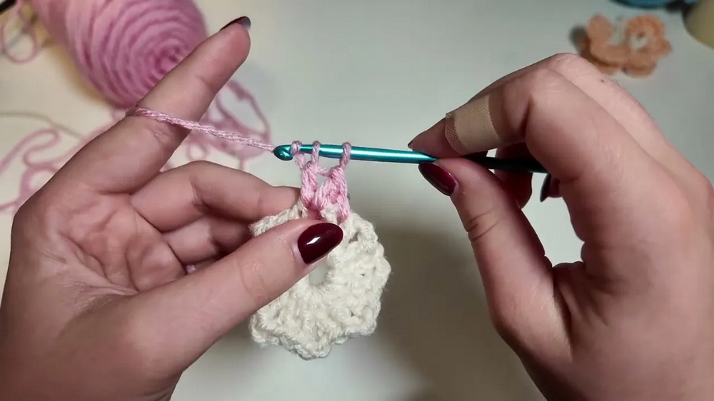 - Repeat Around: Continue working 6 double crochets into each chain-2 space and slip stitching between the double crochets in each section of the ring.