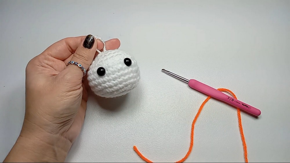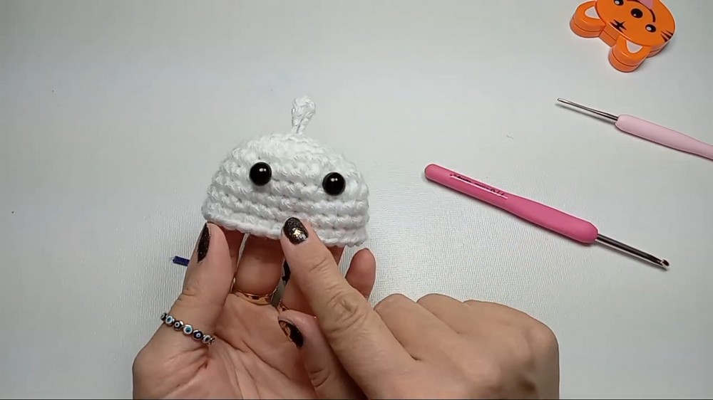 - Insert the eyes between Rounds 5 and 6, leaving 4-5 stitches between them. Secure them with the backs provided.