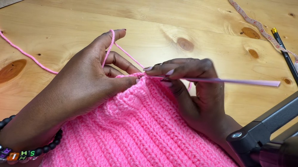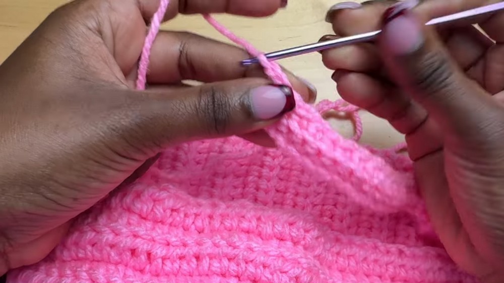 - Attach yarn at the marker and work HDC in both loops until you reach the shoulder seam. Turn work and repeat using back loop half double crochets.