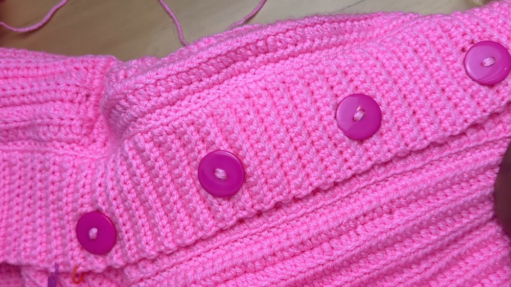 - Ribbing: Chain 12 stitches and work rows of back loop single crochet. Continue for 150+ rows for the cardigan’s edging and add 60 rows for buttonholes spaced evenly.