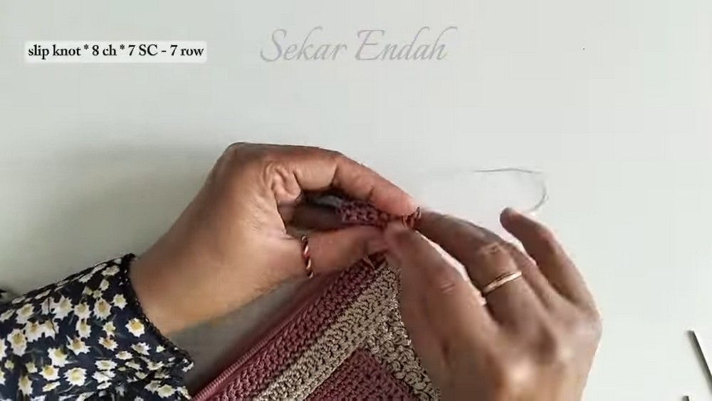 - Finish Zipper Ends: Crochet a cover for the zipper ends using a slip knot and 8 chains, then work 7 single crochets across 7 rows. Fold and sew the ends to secure the zipper head.
