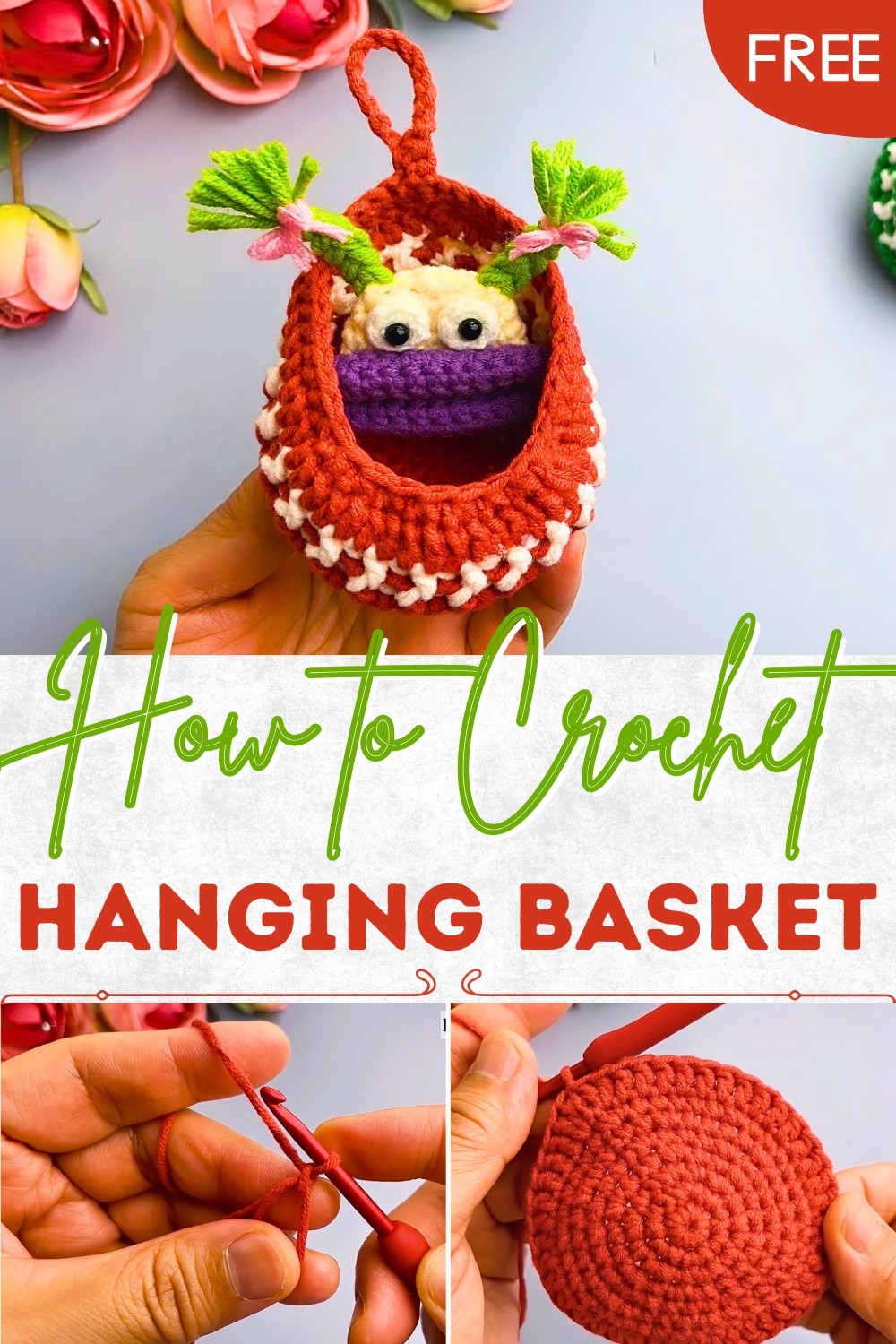 This hanging basket crochet pattern, easy to make and ideal for beginners. It uses basic stitches and beginner-friendly techniques with a gradual building process.