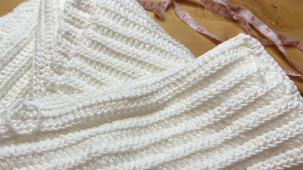 The pattern begins with the creation of two identical panels for the back and front. Both are worked using chains and rows of half double crochets, specifically in the back loop, ensuring a unique textured appearance.