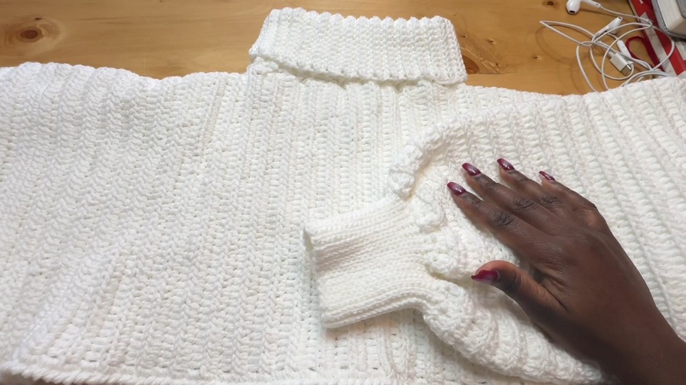 The panels are joined at the shoulders using single crochet stitches, with stitch markers placed for accurate alignment. Sleeves are then added by attaching yarn at the shoulder openings and building rows of back loop half double crochets.