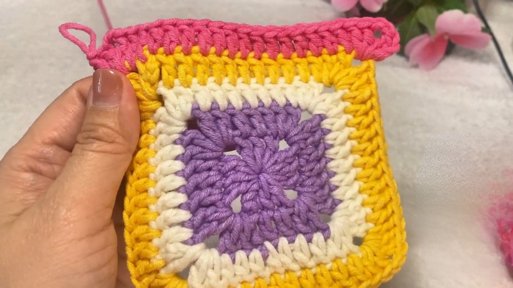 - Once a granny square size is achieved, crochet a round of single crochet stitches around the edge of each square to form a clean border and smooth finish.