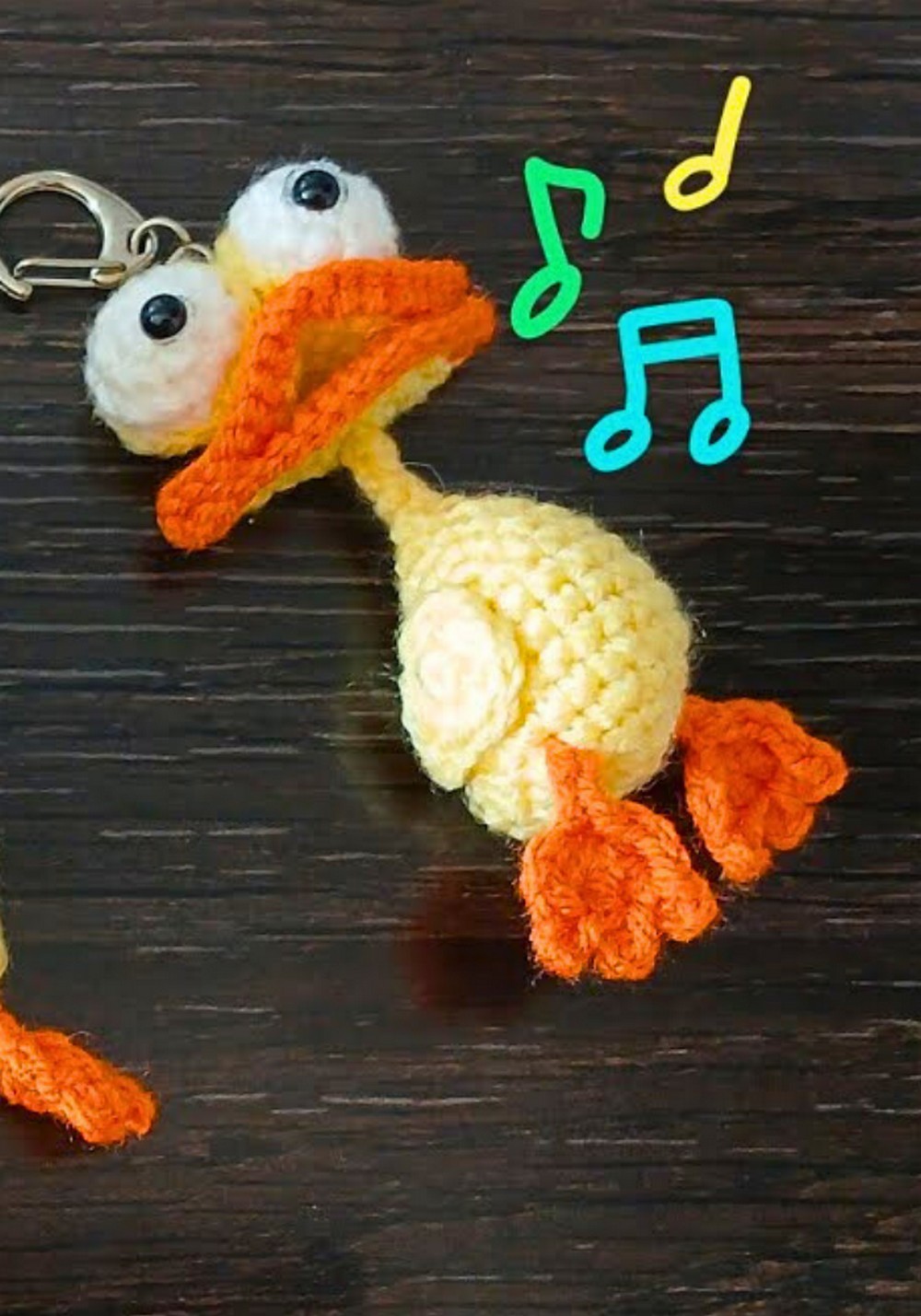 - For the legs, crochet small orange sculptures and attach them to the base of the duck.