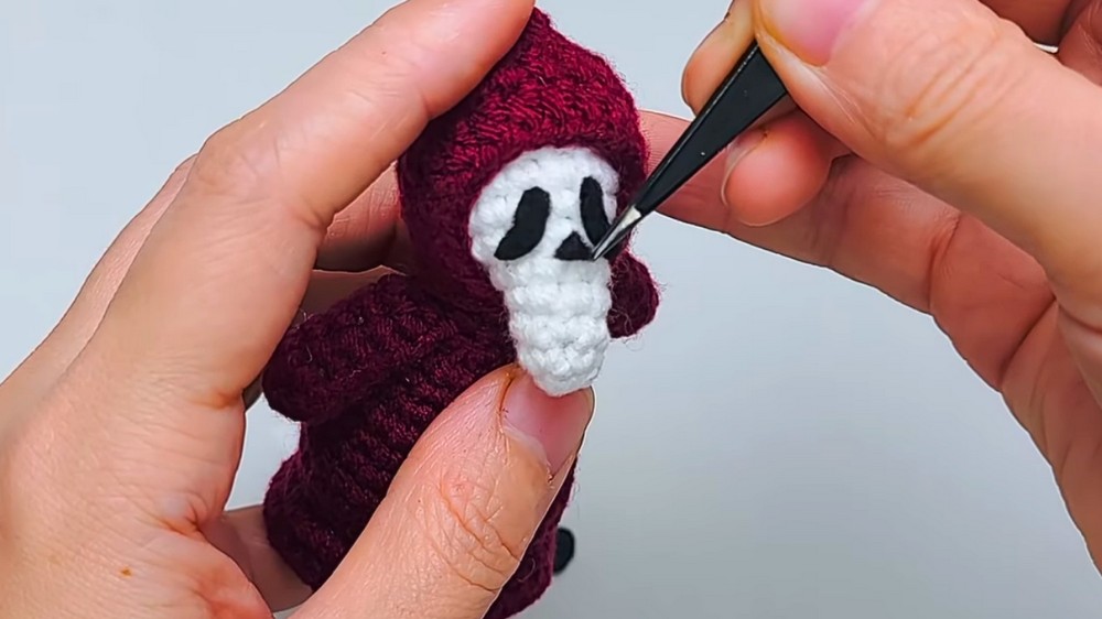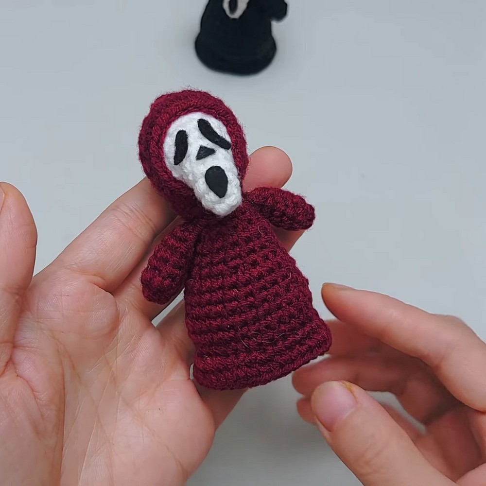 The pattern begins with the ghost’s head, formed using chain stitches to create a circular base. Short stitches are incrementally increased across the first few rounds to shape a smooth ball, followed by steady decreases for a rounded finish.