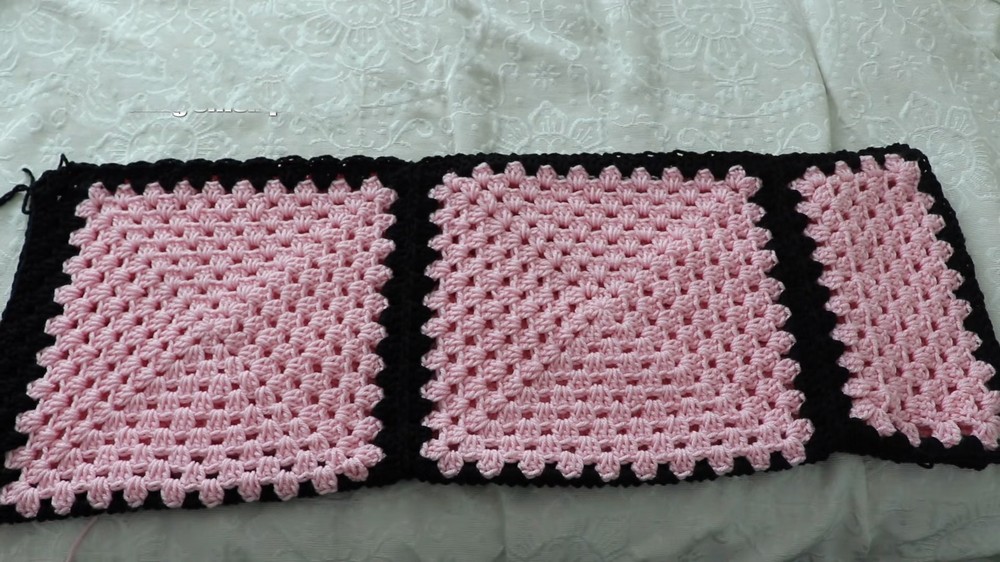 - Arrange as: Granny Square – Panel – Granny Square – Panel – join to form a strip.
