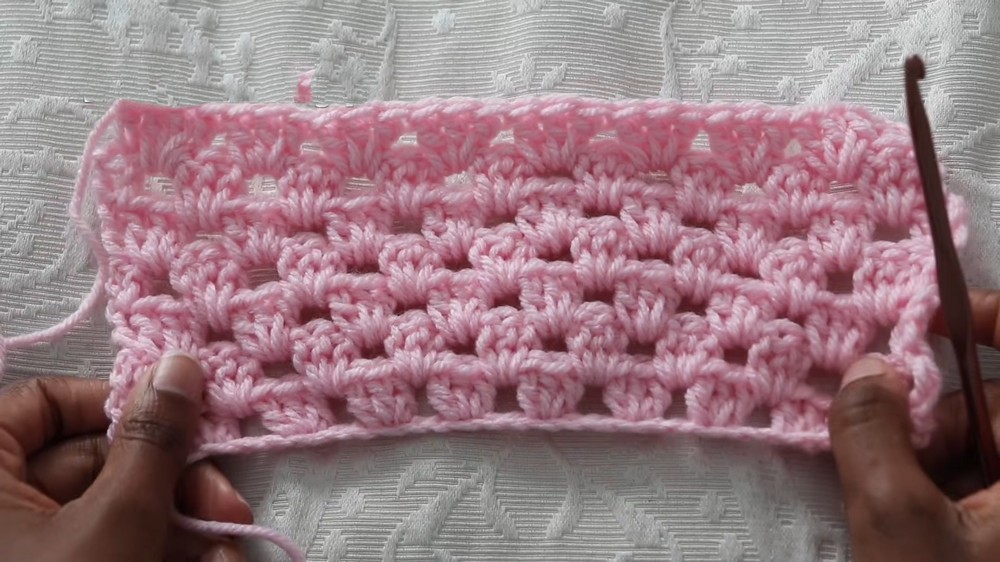 - Row 2: Ch 3, 1 dc in top of previous row’s last dc, 3 dc in next space between clusters; rep across, end with 1 dc in top of ch-3 from previous row. Turn.