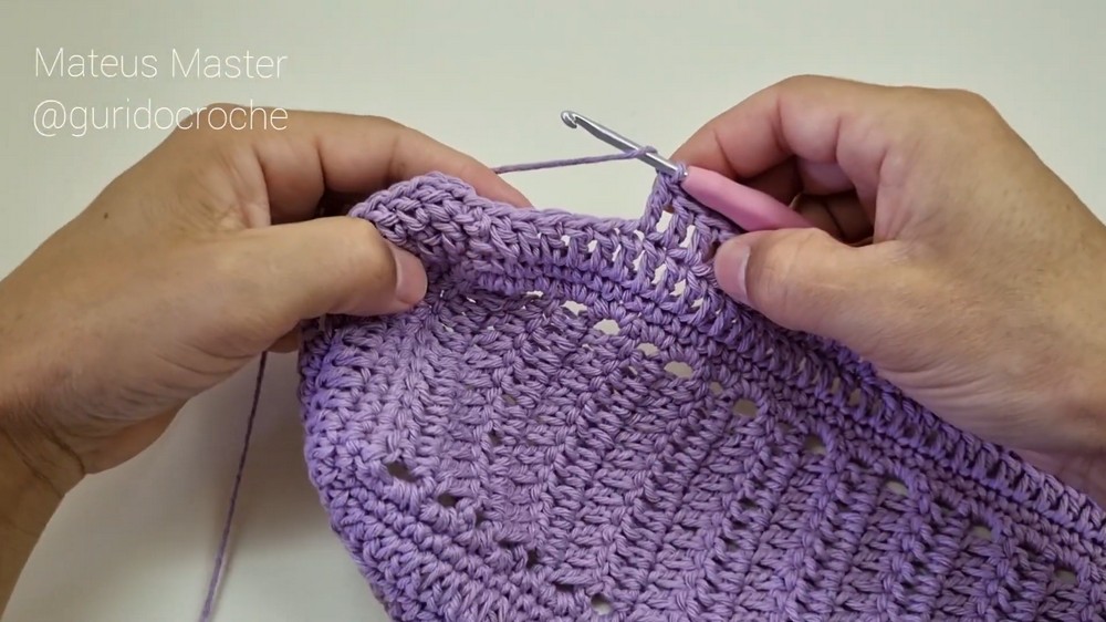 Establish the body, then introduce fancy stitch patterns—groups of alternating double crochets and chain skips—to give the bag its standout texture and design. Repeat these rows of decorative stitching for a total of 19 rows, creating a unique groove in the pattern that draws attention.