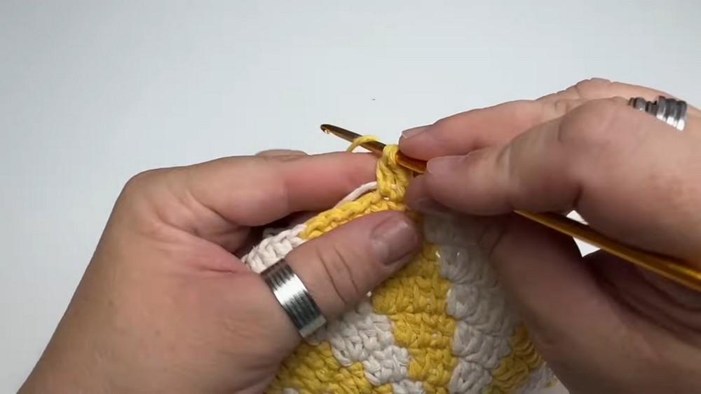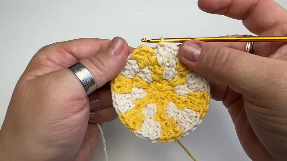 Adding alternating rows of colorful yarn creates the signature lollipop effect that truly sets this pattern apart.