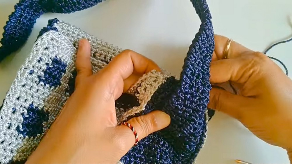 Edges are strengthened with slip stitches and single crochet, which create refined and clean corners. Increasing stitches at the corners helps in forming structured edges that prevent curling or distortion. The bag height can be customized by repeating the pattern, which is worked up to 56 rows in this example.