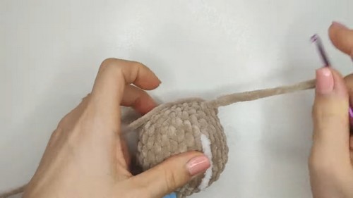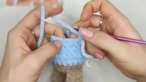- Attach the legs to the body in this round with 3 sc.