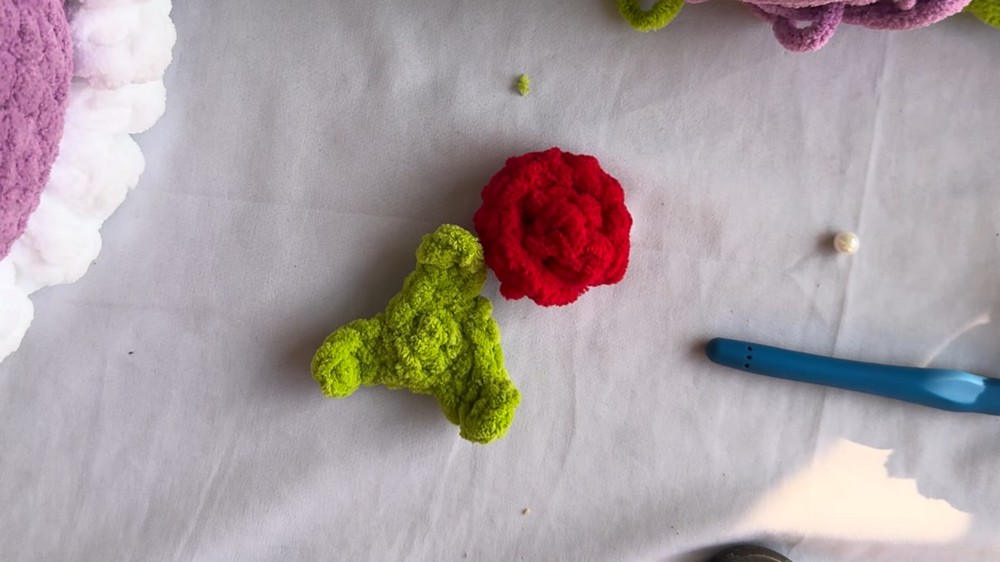 - Yarn: Light to medium weight acrylic or cotton yarn in green (leaf), red (rose), and color(s) of choice (for the base/flower and wrapping/bouquet)
