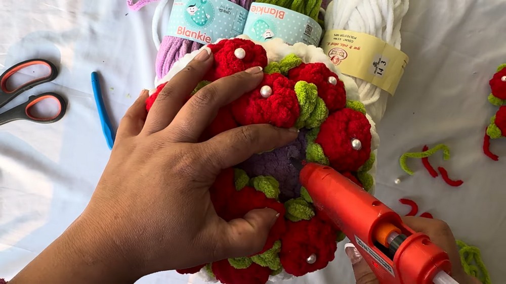 - Optional: Make a long chain, then fasten off, weave ends, and attach as a ribbon to the bouquet base.