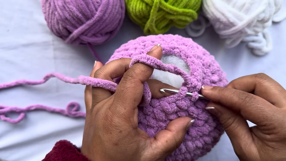 - Continue pattern, decreasing the sc st count between dec by 1 each round (next: 3, 2, 1) until the opening is almost closed.