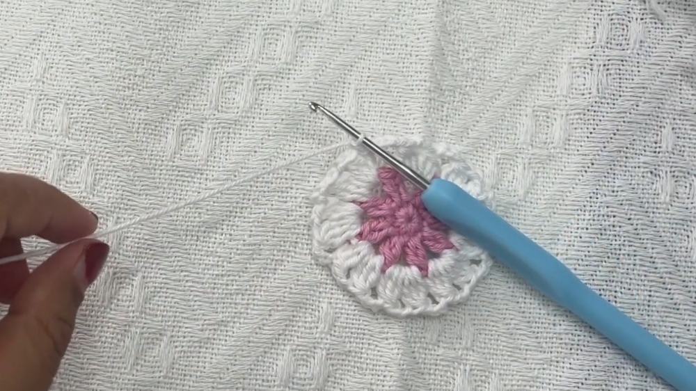 - Repeat the process for all chain-3 spaces: chain 2, 5 double crochets, chain 2, single crochet.