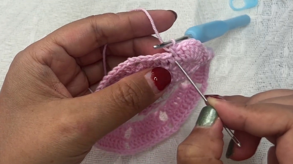 - Switch back to light pink yarn. Insert the hook into any chain-3 space.