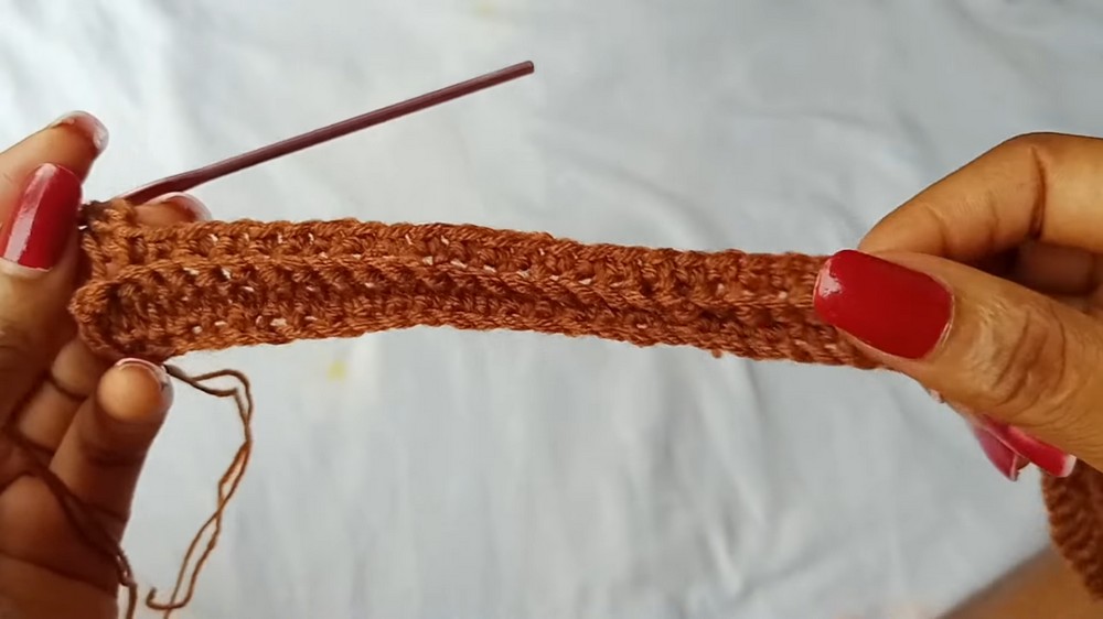 By repeating this method for multiple rows, the panel grows steadily with visible ridged rows that add stretch and texture to the design. The number of rows will depend on the circumference you need for your beanie, as the panel should comfortably stretch to fit your head. For example, 79 rows worked in the tutorial produced a panel measuring 18 inches wide that stretched easily to a head size of 23 inches.