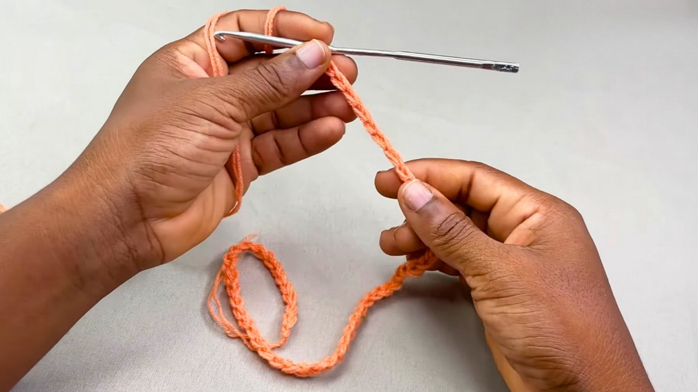 - Continue making the double crochet into every stitch along the chain without skipping.