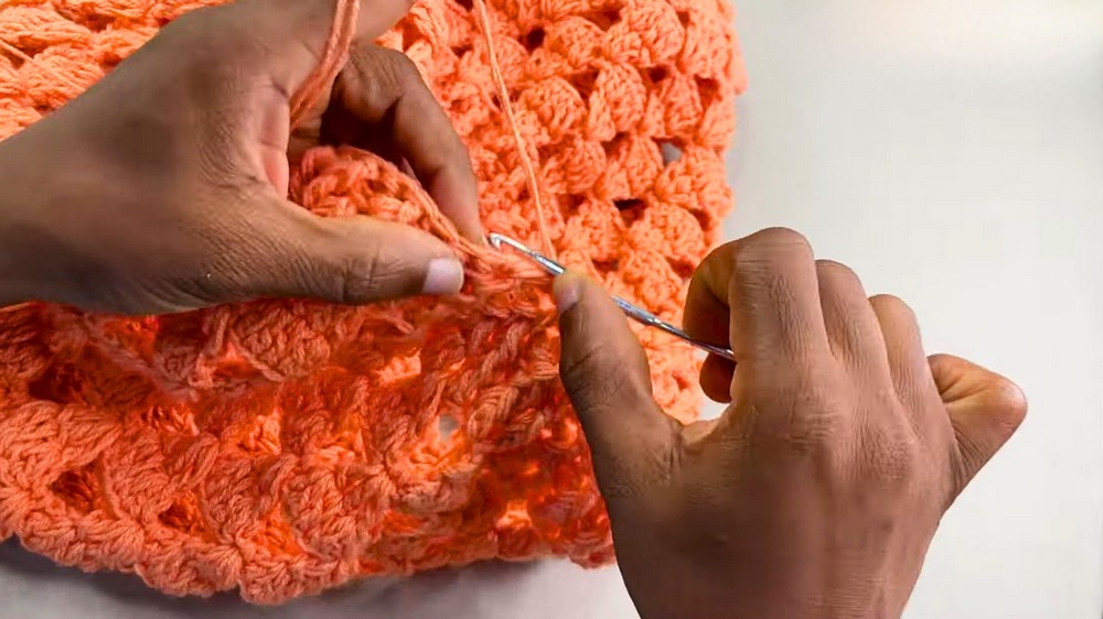 - Odd-numbered rows follow the “foundation pattern” of 3 chains and 3 double crochets into the single crochet space.