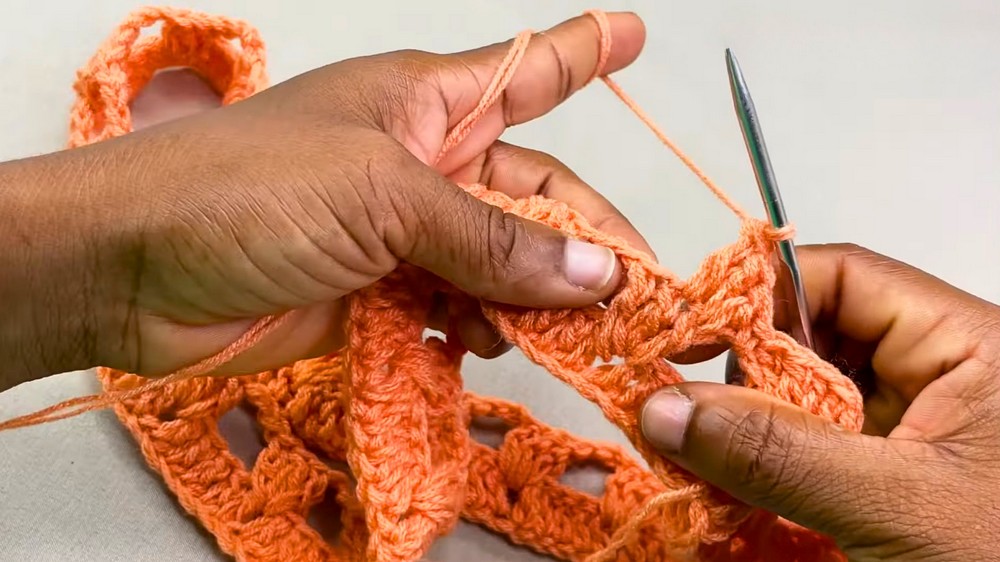 - Continue the pattern around: 3 chains, skip four stitches, and 3 double crochets into the fifth stitch until the end of the round.