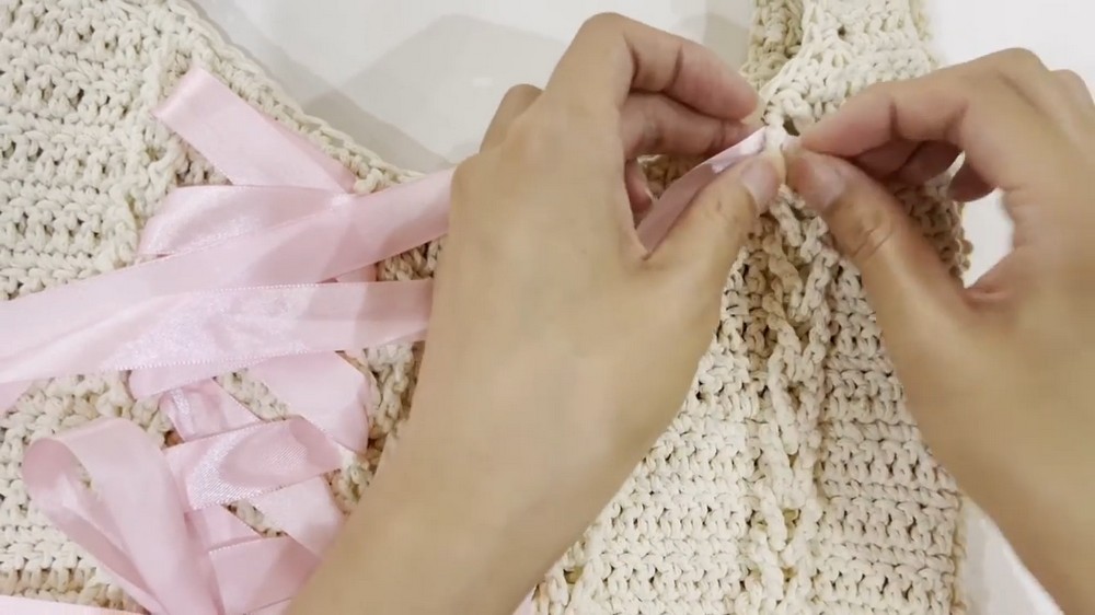 - Secure the ribbon by threading it through alternate loops in a lattice pattern. Adjust it to your preference and tie it with a bow. Trim and seal ends with a lighter for added durability.