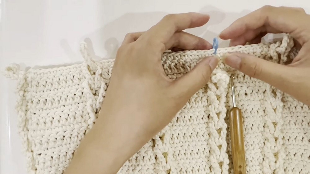 - Start from the side of the bag. Pick up two stitches from each double crochet row.