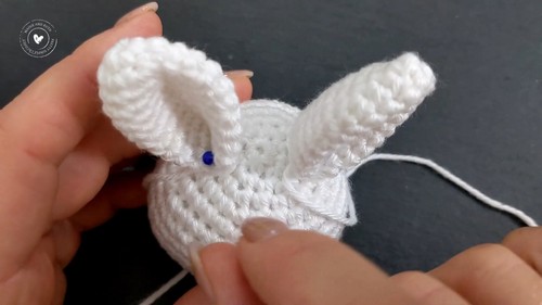 - Sew the ear together at the base, fasten off, and leave yarn tail for sewing.