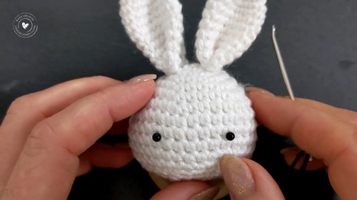 - Use black yarn for eyes and pink yarn for the nose. Start the eyes on the 9th round and embroider the nose on the 10th round.