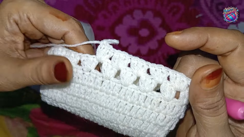 - Weave the String: Weave the string through the topmost row, creating a drawstring-like closure.