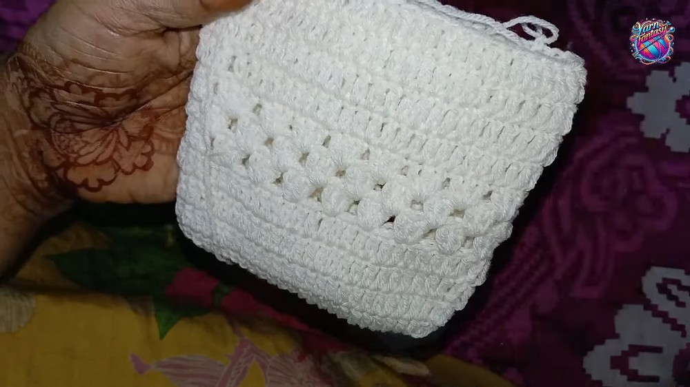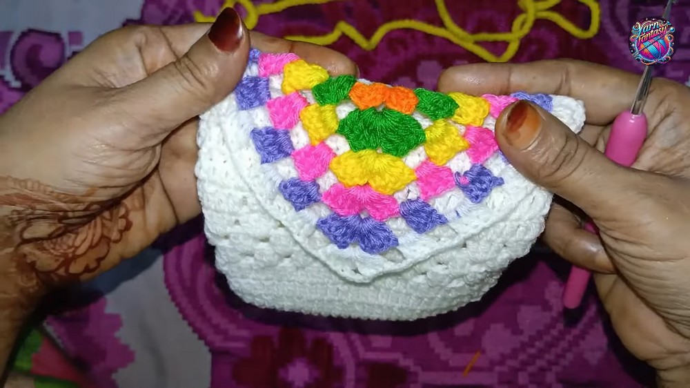 - Decorative Upper Cover: A colorful upper flap is added using rows of alternating colored yarn. The magic ring technique enhances its design.