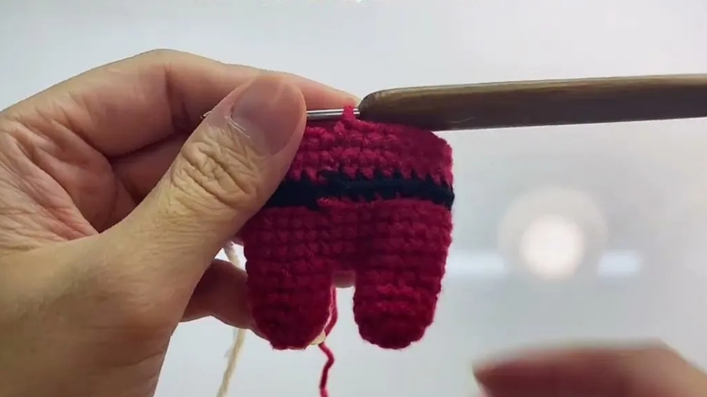 - At the 5th row, switch to black yarn for the “belt” section. Crochet 10 single stitches.