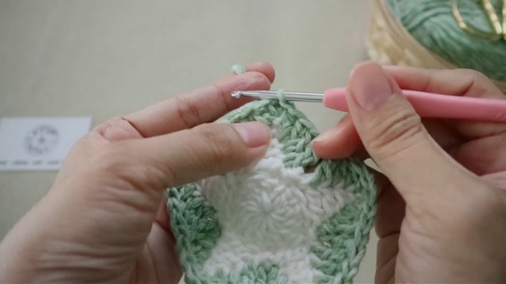 - Reintroduce the white yarn by attaching it to the first space.