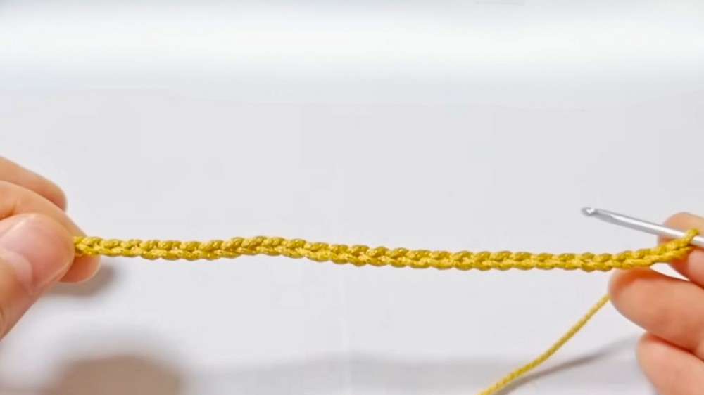 - Work a double chain: With two strands, make a long chain (~50 cm), keeping it thick. Fasten off, leave tails to help threading.