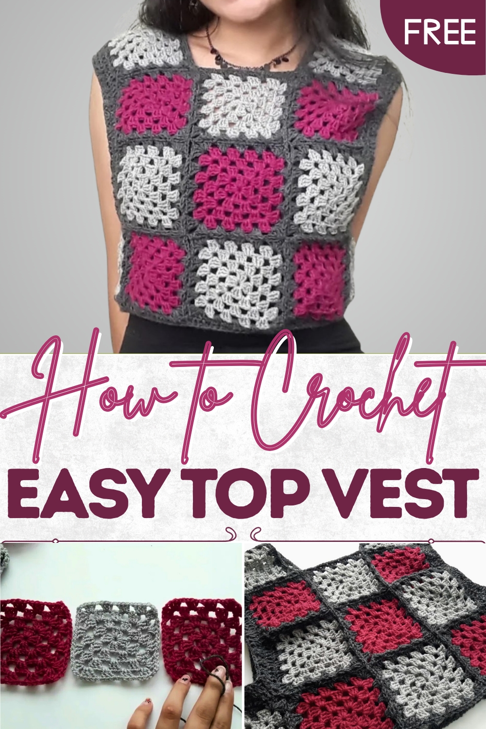 - Color Combinations: The creator used three colors for the sample vest: a light grey, fuchsia, and a darker grey for joining the squares. The creator suggests alternating colors for each round of the granny squares for a multicolored effect.