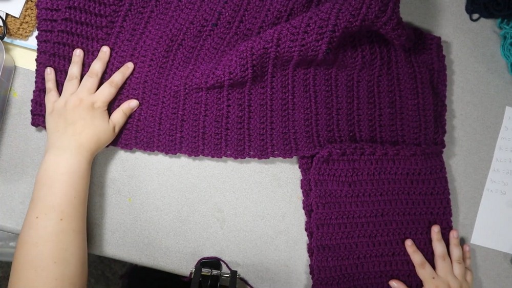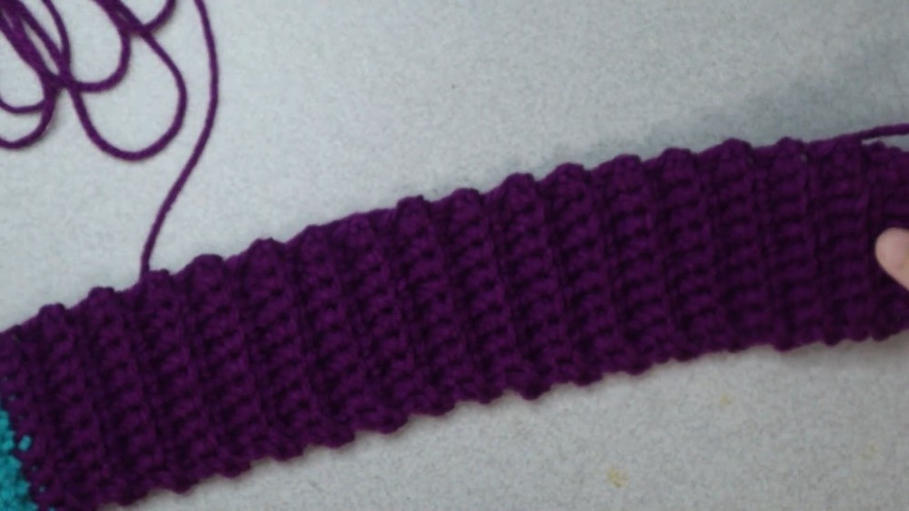 - Rotate ribbing so you will crochet along the long edge, picking up stitches (one stitch per row).