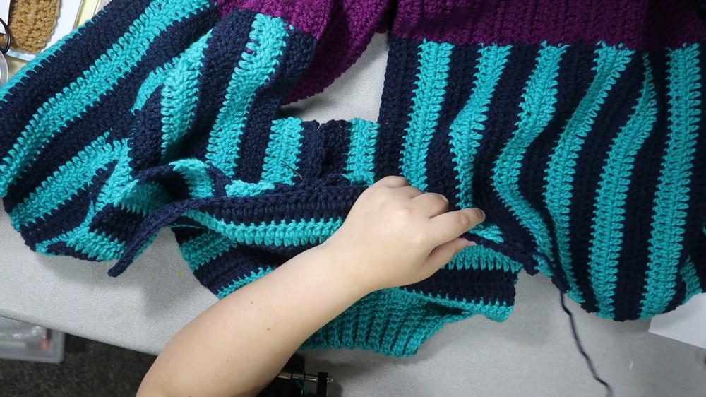 - Use remaining long tails from sleeve ribbing to sew up the length of the sleeve and then down the body side seam.