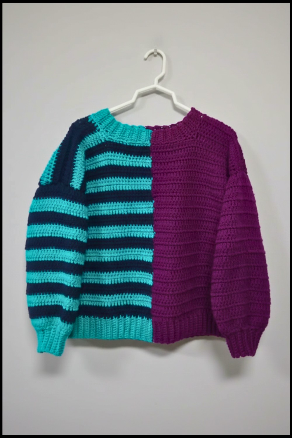 Feeling cold or tired of plain old sweaters can make days less fun and cheerful but there’s a colorful way to brighten things up. Mixing two lively shades in the crochet half n half sweater pattern lets you enjoy a cozy fit and a fresh look at the same time. One side shines with a different color from the other making your outfit look full of energy and style.