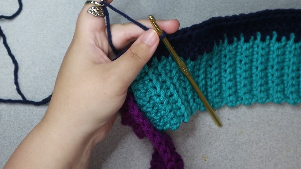 - For each color section of ribbing, dc one stitch into the side of each row (e.g., 36 dc in each color for 36 rows = 72 dc total across the row).