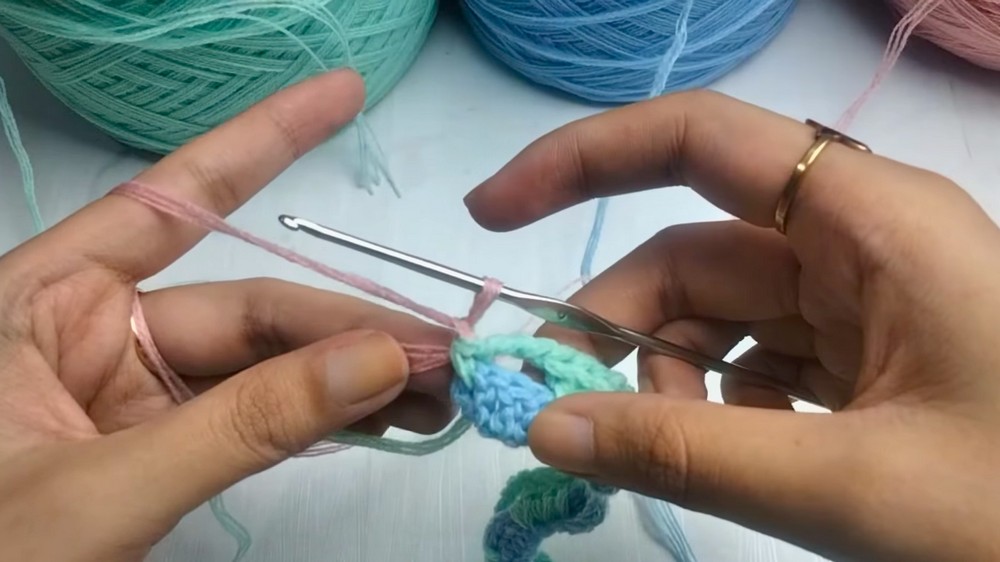 When changing colors, do not cut the yarn. Carry the unused color up the side of the work. Since the sides will be hidden in the seam during assembly, this saves time and reduces the number of ends you need to weave in.