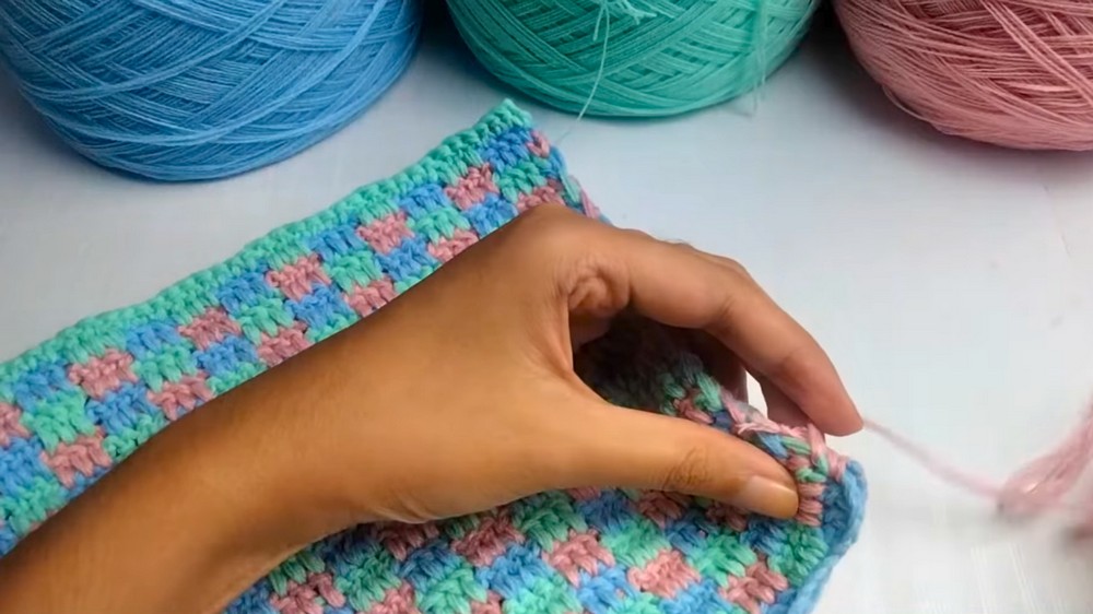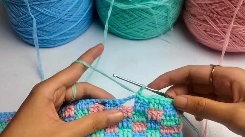 Yarn: Medium Weight (Size 4) Acrylic yarn. The video demonstrates a two-color grid effect (e.g., Black and Green).