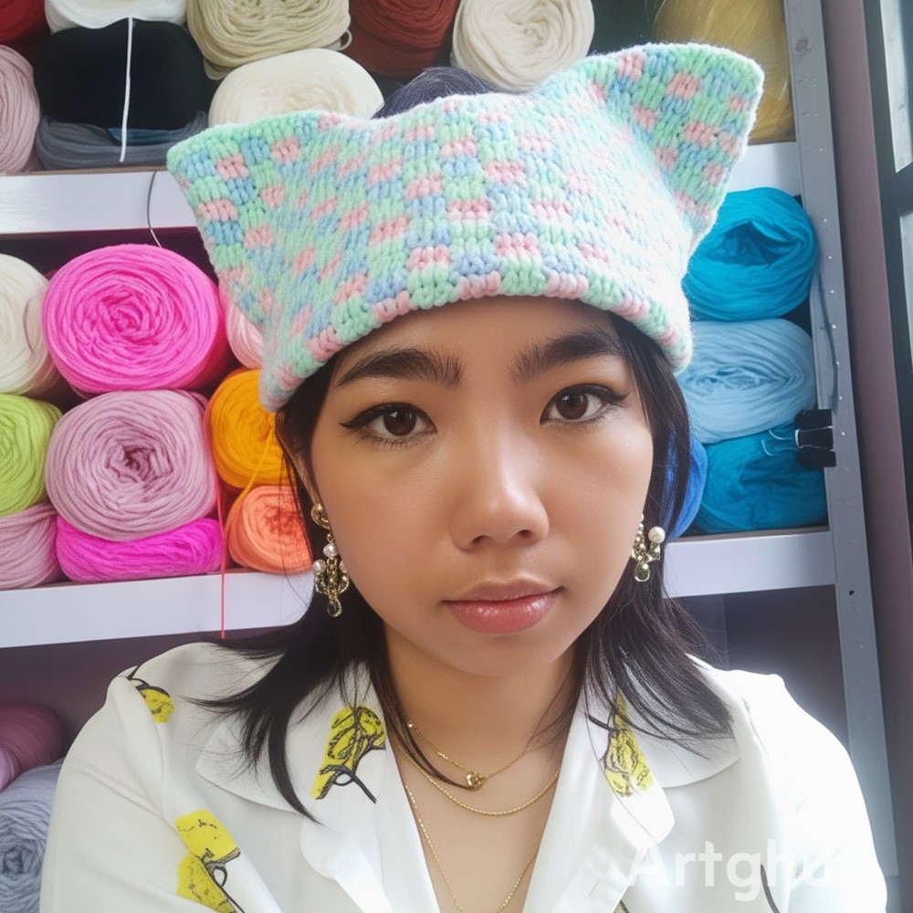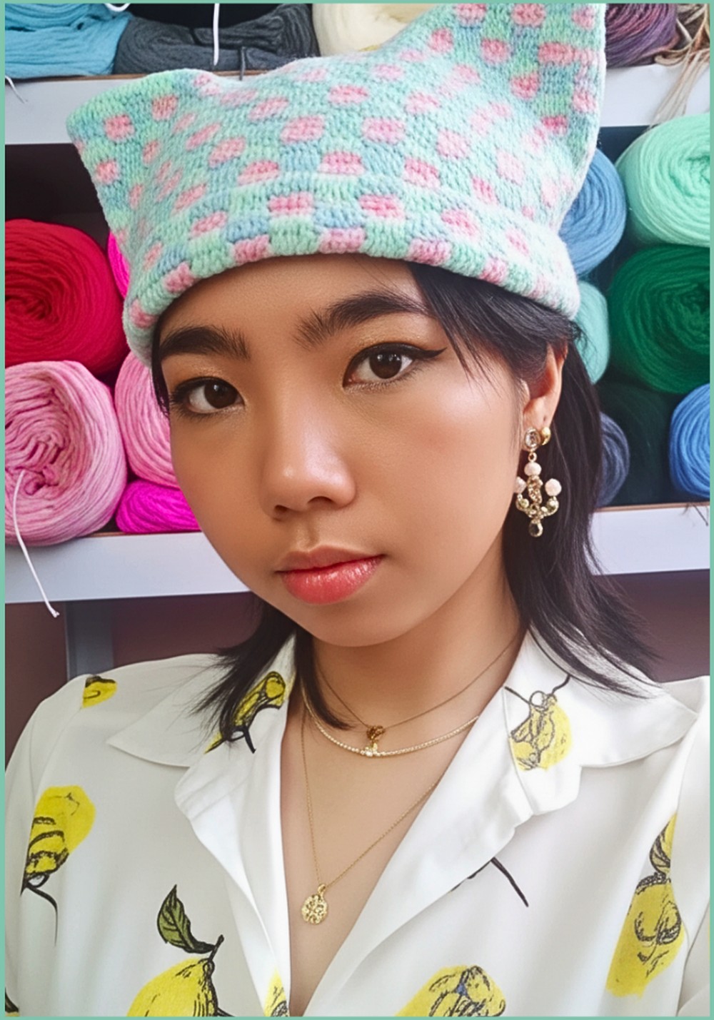 The Grid Stitch Cat Ears Beanie is a trendy, geometric take on the classic square-top hat. The grid technique used here creates a thick, warm fabric that holds the shape of the ears firmly without needing extra stuffing or stiffening.