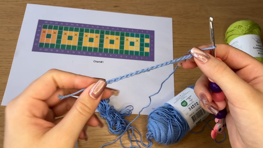 - Yarn: Hobbii’s Friends Cotton 84 yarn in two contrasting colors. This helps make the stitches and design clearly visible.