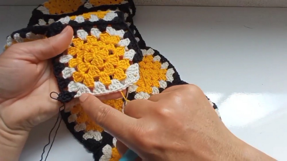 - Turn the work sideways and use single crochet stitches to begin attaching adjacent squares.